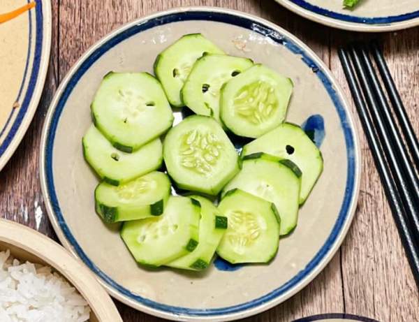 Dưa chuột ngâm nước muối loãng rồi rửa sạch. Gọt vỏ rồi thái dưa chuột thành lát mỏng và bày ra đĩa.