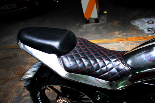 Bình xăng gò bằng chất liệu inox bóng loáng, đuôi xe vuốt nhọn, dẹp, mang xu hướng dòng nakedbike hiện đại. Hai bên hông bình xăng và yên xe nẹp da màu đen may hình sọc ca-rô với đường chỉ khâu màu đỏ nhằm tăng nét cổ điển.