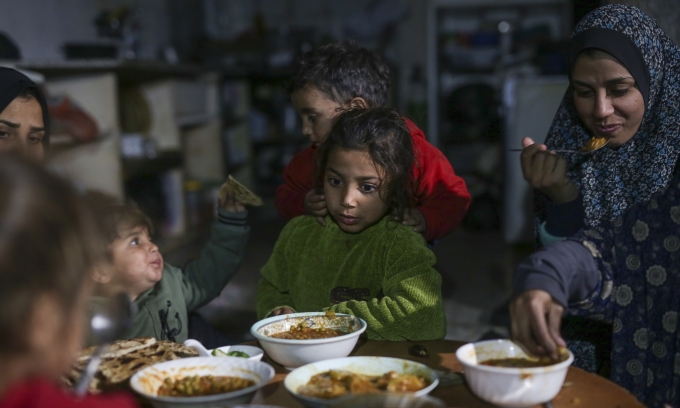 Một gia đình người Palestine ở Jabaliya, Dải Gaza, dùng bữa đầu tiên trong tháng ăn kiêng Ramadan ngày 1/3. Ảnh: AP