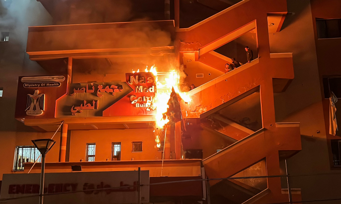 Hỏa hoạn tại bệnh viện Nasser sau đòn không kích của Israel hôm 23/3. Ảnh: AFP