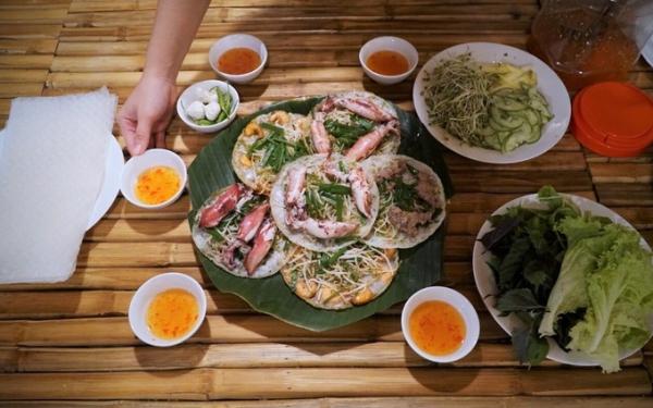 Mâm bánh xèo miền Trung nổi bật với nhân tôm, mực tươi, ăn cùng rau sống cuốn bánh tráng chấm nước mắm ngọt. Ảnh: Phạm Linh