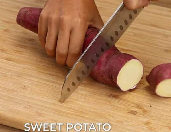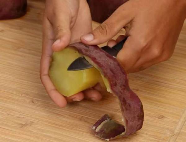 Và cắt bỏ vỏ khoai lang như hình hướng dẫn rồi để sang một bên