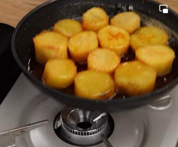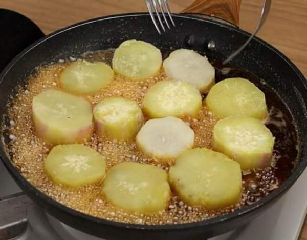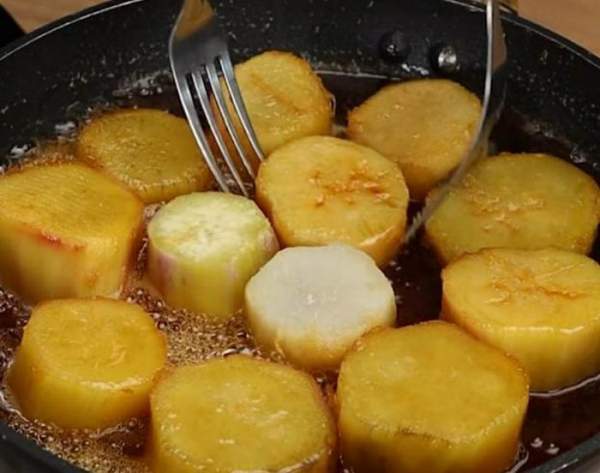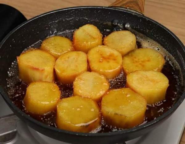 Sau đó, bạn lần lượt cho khoai lang đã gọt hết vỏ vào chảo và đun nhỏ lửa cho nước đường ngấm ngấu vào khoai lang