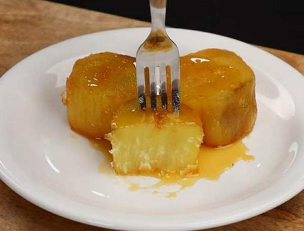 Và thưởng thức. Khoai lang lúc này ăn vừa bở vừa ngọt như mật, dễ ăn không khác gì ăn bánh ngọt. Chúc các bạn thành công và ngon miệng! (Công thức chế biến dịch từ YumRecipes, ảnh cắt từ clip của YumRecipes)