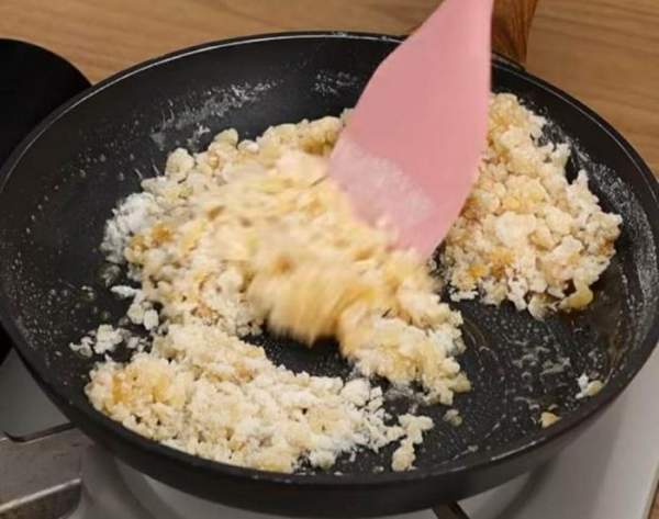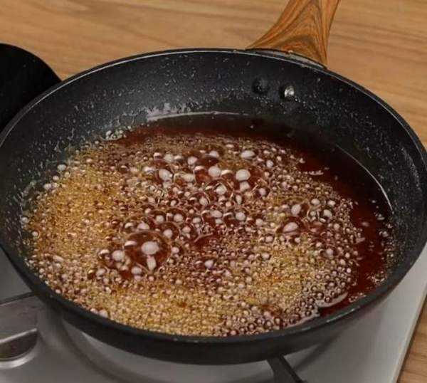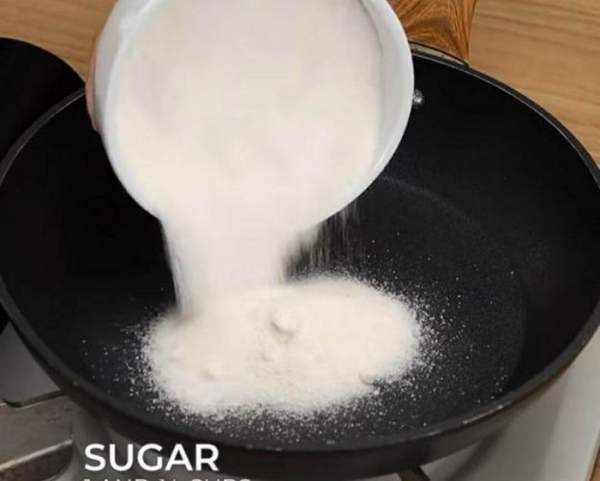Tiếp đó, bạn bắt đầu thắng đường. Bạn đổ bát đường vào chảo sau khi đã làm nóng chảo