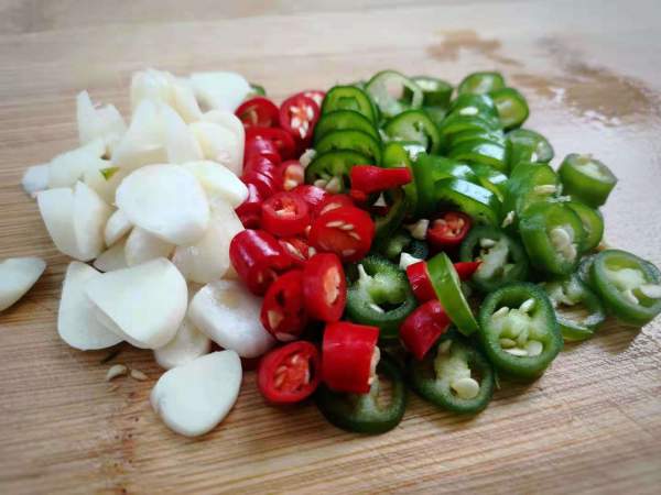 Ớt đỏ và xanh thái khoanh nhỏ. Tỏi thái lát hoặc băm nhỏ.