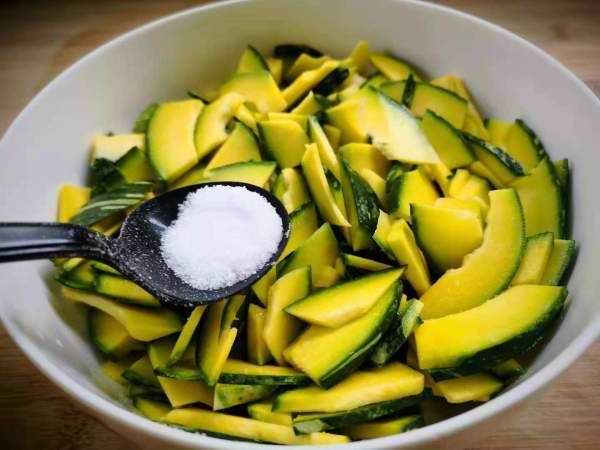 Thái bí thành từng lát mỏng, cho vào tô, thêm 1 thìa muối, trộn đều và ướp trong 10 phút. Bước này để bí không bị chảy nước trong quá trình xào.