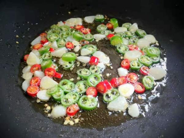 Đun nóng chảo, cho ít dầu ăn vào sau đó đổ hai loại ớt và tỏi cắt lát vào phi thơm.