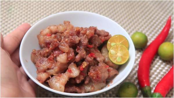 Thịt ba chỉ thái thành miếng nhỏ vừa ăn, đem ướp cùng với mắm tôm và bột canh.