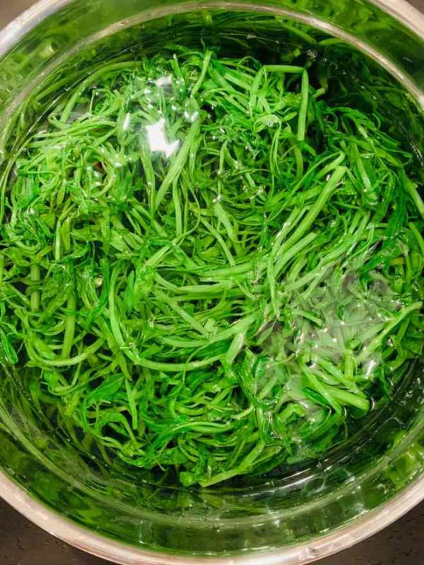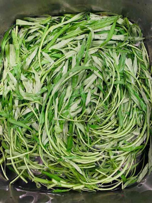 Rau muống nhặt sạch, rửa và ngâm trong nước muối loãng khoảng 20 phút. Nếu muốn ăn rau giòn hơn thì bỏ bớt phần lá