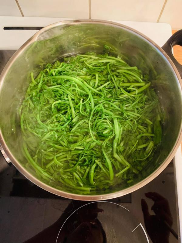 Đun nước thật sôi, cho xíu muối rồi thả rau vào luộc. Đun lửa to, đảo đều, rau sôi thì để thêm 1 phút là tắt bếp (không luộc kĩ quá rau bị nhũn không ngon).