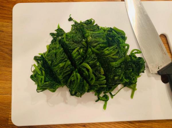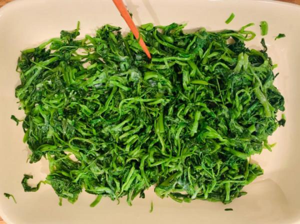 Rau muống vắt nhẹ cho khô nước. Thái miếng vừa ăn