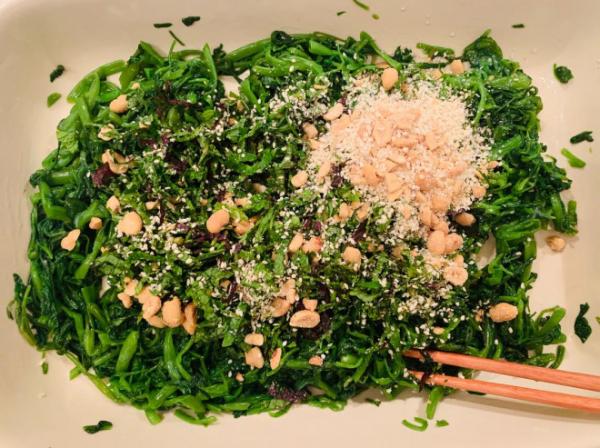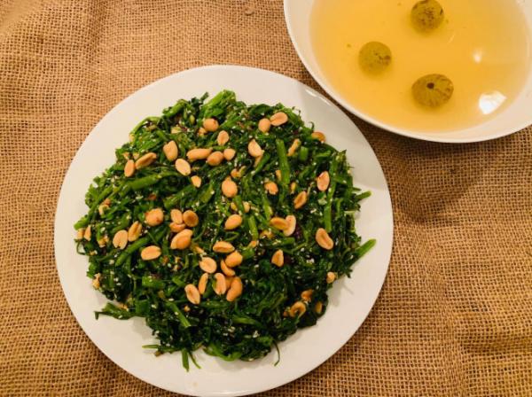 Nguyên liệu: Rau muống, mẻ chua, đường, mắm tôm, muối, lạc, vừng rang chín.