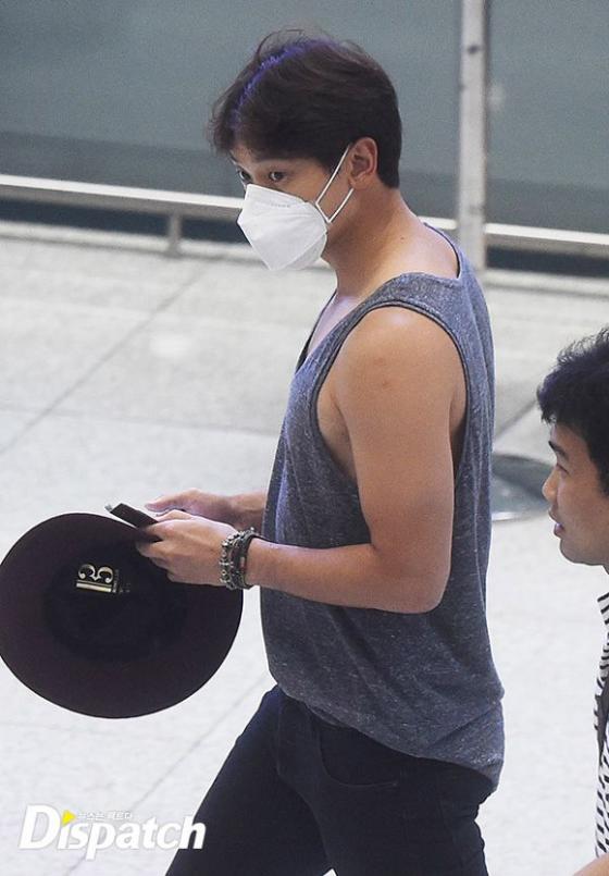 Tại sân bay, cả hai đều mặc trang phục rất thoải mái và đeo khẩu trang. Trong khi Rain khoe thân hình vạm vỡ với áo ba lỗ màu xám và quần đen thì Kim Tae Hee mặc váy trắng, áo phông màu nude kết hợp xăng đan điệu đà.