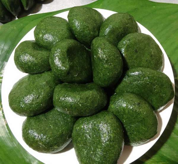 Để giữ màu xanh tươi và mau nhừ của món bánh đặc sản này thì lá ngải cứu sau khi được rửa sạch sẽ đem luộc qua với nước vôi. Ngoài nước vôi, bà con dân tộc Tày còn sử dụng nước tro bếp để luộc lá ngải trong 2 đến 3 giờ.