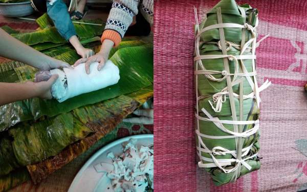 Giò nây có vị béo ngậy, đậm đà của thịt, dậy mùi thơm từ các loại gia vị và có màu xanh hấp dẫn của lá chuối. Ảnh: Bảo Duy
