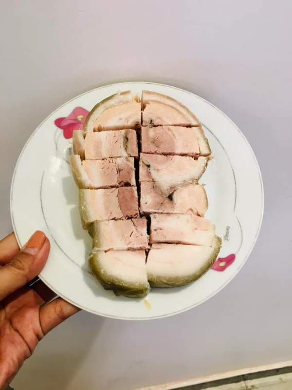 Thịt ba chỉ nguyên miếng được sơ chế sạch, tẩm ướp gia vị rồi cuộn chặt, buộc lạt như giò lụa.Ảnh: @thuynt1402