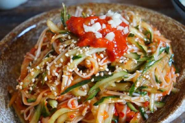 Món nộm đơn giản từ dưa chuột và nấm kim châm rất thích hợp để làm món khai vị cho ngày hè nóng nực. Nấm kim châm dai dai ngọt ngọt cùng với dưa chuột giòn ngon, mát lạnh kết hợp với nước sốt cay, chắc chắn sẽ đánh bay cảm giác chán ăn, mệt mỏi vì thời tiết oi bức.