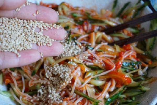 Bước 4: Sau khi nấm và dưa chuột đã ngấm gia vị, rắc thêm vừng rang và trộn đều để món nộm được thơm hơn.