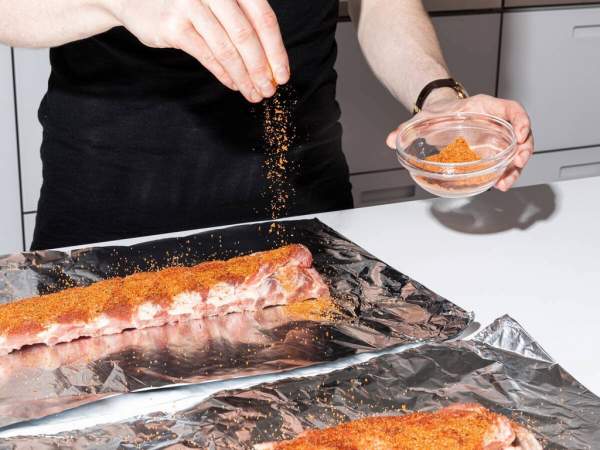 Loại bỏ lớp màng ở mặt trong của sườn, sau đó rắc đều hỗn hợp khô vừa trộn lên khắp hai mặt sườn cho đều.