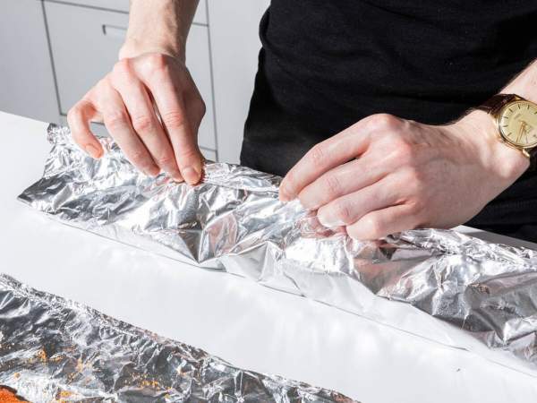 Gói từng miếng sườn trong giấy bạc sao cho mặt thịt nằm phía dưới và nếp gấp của giấy bạc ở trên cùng (đảm bảo các mép phải bọc kín). Để yên vài giờ hoặc để trong tủ lạnh qua đêm.