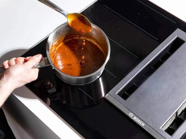Đun nhỏ lửa hỗn hợp nước sốt trong 5-10 phút. Thêm một ít nước vào khuấy đều tạo thành hỗn hợp sệt mịn rồi đổ ra bát.