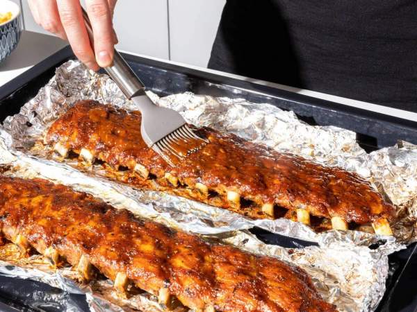 Lấy sườn ra khỏi lò và quét nước sốt lên bề mặt. Đặt khay sườn nướng vào lò trở lại và nướng thêm 5 phút.
