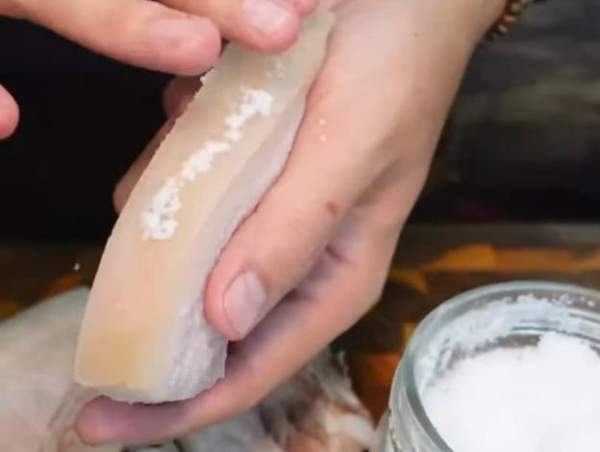 Xăm xong các bạn xát đều muối lên bì miếng thịt và xát muối cả vào 2 bên miếng thịt.