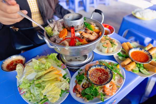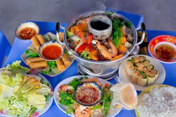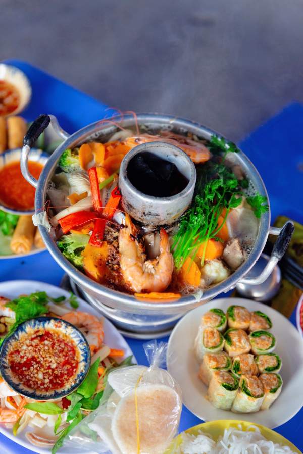Sài Gòn đang độ mùa mưa, tan làm ngồi trước chiếc nồi nghi ngút khói, húp miếng lẩu ấm bụng kèm miếng lòng heo chấm mắm ớt cay thì sướng phải biết.