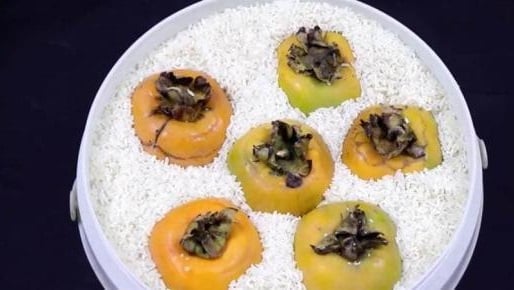 Đây là cách làm chín hoa quả được dân gian áp dụng từ lâu đời. Bạn có thể vùi những quả hồng còn xanh (hoặc bất cứ loại trái cây nào cần ủ chín) vào trong thùng gạo. Chờ khoảng 4-5 ngày là hồng sẽ chín và có thể ăn được.
