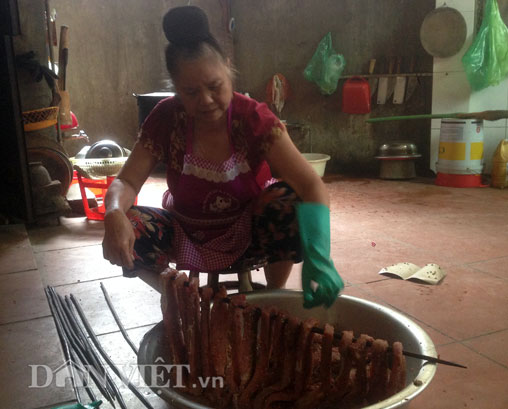 “Các gia vị ướp thịt như: ớt, gừng, tỏi, hạt tiêu, mắc khén...đều được trồng trên nương nhà mình nên luôn bảo đảm sạch và đậm đà hương vị.Thịt ướp xong được dùng que tre xiên lại và treo lên gác bếp hoặc trên giàn than củi để hong khô và lấy màu, lấy mùi khói”, chị Doan cho biết thêm.