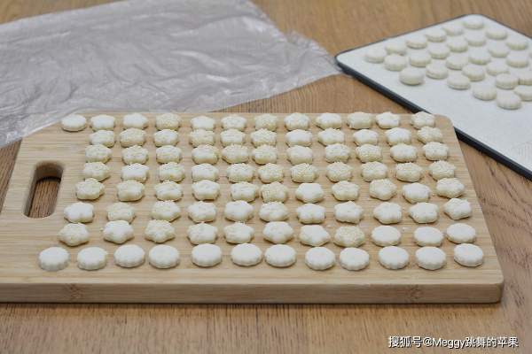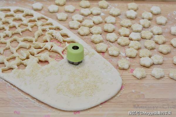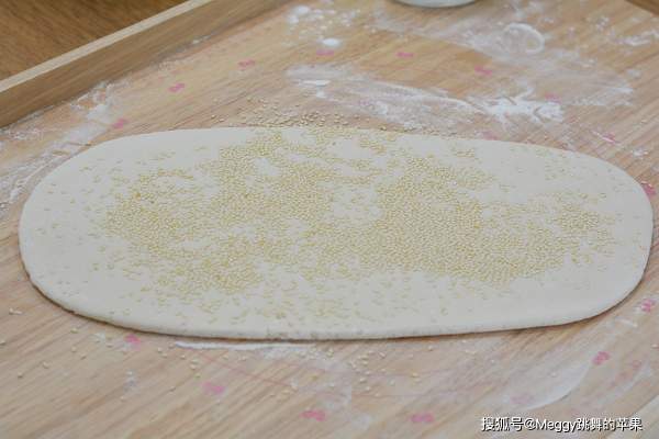 Cho bột lên thớt, rắc một ít bột khô bên dưới, nhồi đến khi không dính tay. Cán bột thành lớp dày 8mm, phun một ít nước lên bề mặt rồi rắc mè lên.