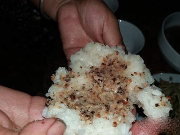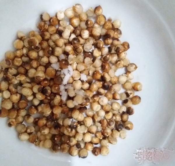 Sau khi nhặt thật sạch lớp vỏ cứng, để chế biến thành món ăn phải dùng chày đâm phần nhân thật nhuyễn và cho thêm một ít muối trắng để tạo vị đậm đà.