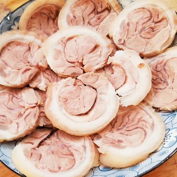 + Cuối cùng bạn cắt bỏ chỉ và xắt thành các khoanh mỏng khoảng 1 - 2cm sao cho vừa ăn. Những lát thịt hồng hào vô cùng đẹp mắt, nhất là thịt chân giò không bị hôi, tanh. Lớp da giòn sần sật bao bọc bên ngoài cùng phần thịt mềm, ngon.