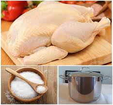 - Gà: 1 con ( khoảng 1kg); 1/2 bát muối (dùng bát ăn cơm để đong muối)