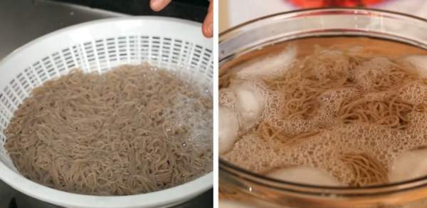 Sau khi luộc xong, vớt mì ra ngâm vào bát nước lạnh hoặc xả dưới vòi nước để mì nguội. Việc này giúp loại bỏ phần bột đã bị hồ hóa bên ngoài sợi mì, làm sợi mì không bị dính vào nhau khi xào, nấu. Nếu vớt mì ra mà không ngâm với nước lạnh, sợi mì vẫn giữ nhiệt độ cao và tiếp tục chín dẫn tới mì bị nát, bết dính vào nhau.