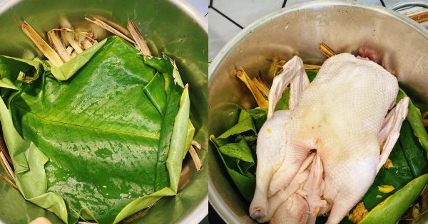 Lót sả, lá dong xuống dưới sẽ giúp nồi không bị cháy. Trong quá trình "vịt xông hơi", hơi nước đọng ở nắp sẽ chảy xuống.