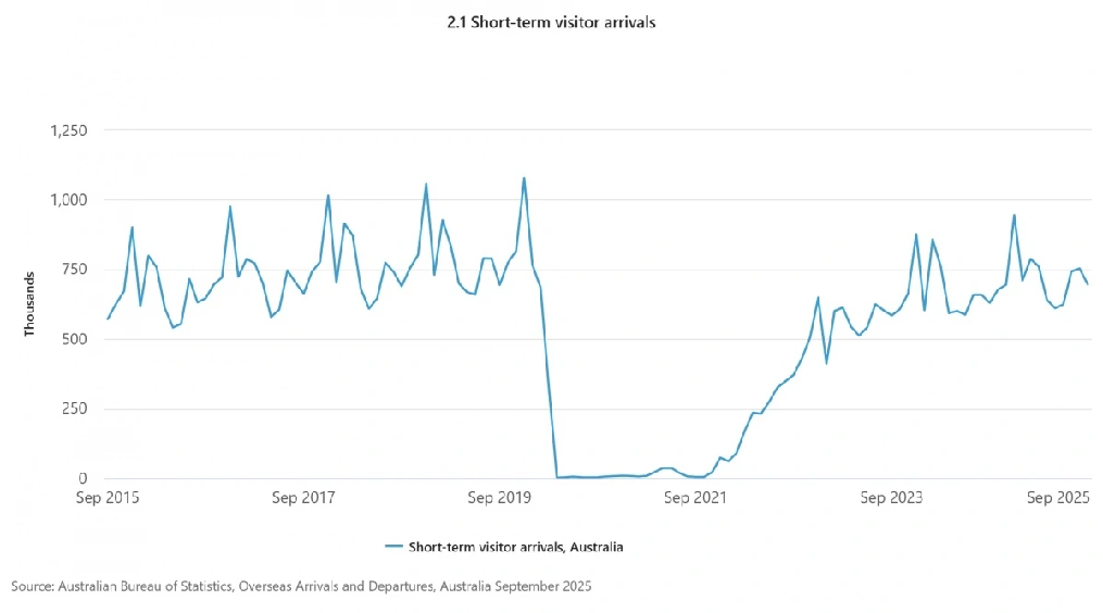 Tính riêng tháng 9/2025, du khách từ New Zealand là nhóm đông nhất với gần 136 nghìn chuyến đi tới Australia. Tiếp đó là Trung Quốc với hơn 83 nghìn chuyến, đứng thứ ba là Anh với gần 47 nghìn chuyến và Mỹ đứng thứ tư với gần 42 nghìn chuyến.