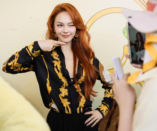 Phần tay áo và thân áo suông giúp tổng thể trở nên thoải mái, không phô trương nhưng vẫn cực kỳ cuốn hút. Đi kèm với đó là chân váy đen xếp ly tôn dáng và mái tóc đỏ sóng nhẹ – một màu tóc vốn không dễ diện nhưng Minh Hằng lại biến nó thành dấu ấn cá nhân nổi bật.