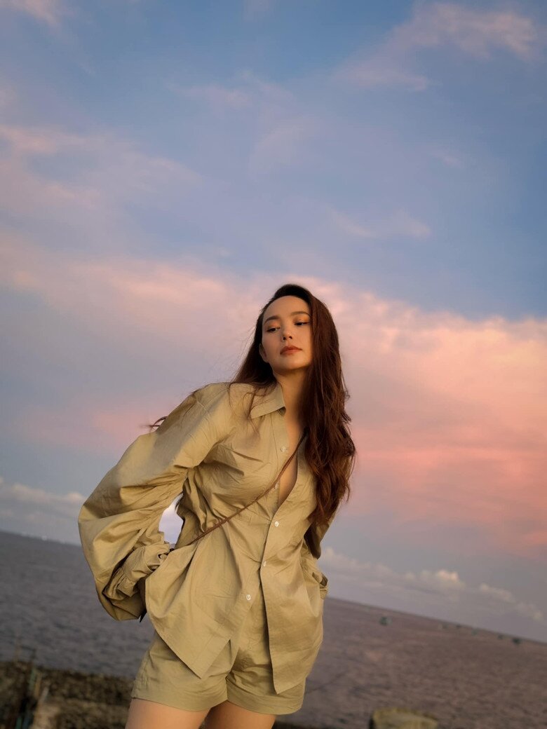 Minh Hằng chọn set đồ ton-sur-ton màu beige gồm áo sơ mi dài tay và quần short ngắn, mang đến cảm giác tối giản nhưng vẫn đầy cuốn hút.