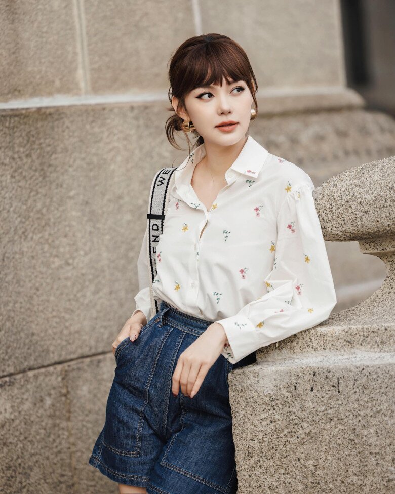 Trong một dịp khác, Minh Hằng diện áo sơ mi trắng tay phồng phối cùng quần short denim và giày cao gót nơ bản to – một công thức tưởng chừng đơn giản nhưng lại vô cùng hiệu quả.