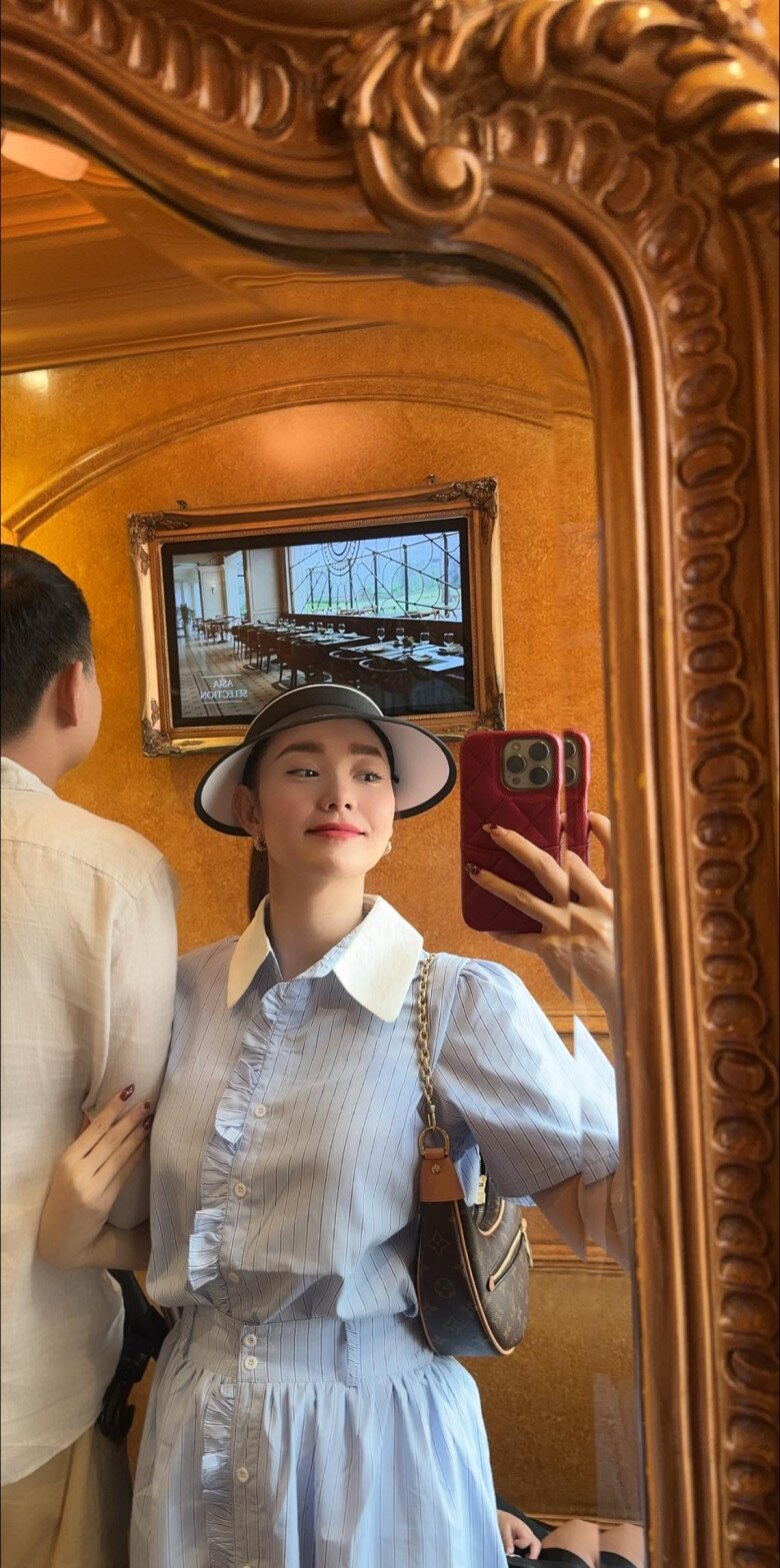 Bộ váy sơ mi kẻ sọc tông xanh pastel, cổ trắng bản to và hàng cúc điểm xuyết bèo nhún nhẹ kết hợp chiếc nón rộng vành mang hơi hướng cổ điển cùng túi Louis Vuitton quai xích là những điểm nhấn hoàn hảo, khiến tổng thể trở nên thanh lịch mà không kém phần trẻ trung, nữ tính.
