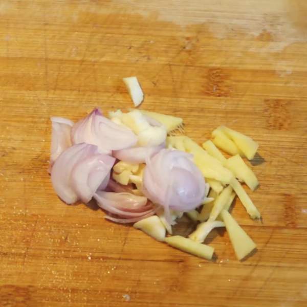 Bạn bóc vỏ hành tím, nạo vỏ gừng và cắt lát. Tỏi bóc vỏ, băm nhỏ.