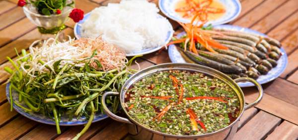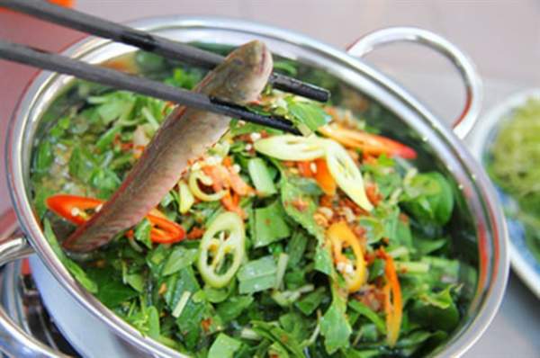 Món ăn tăng thêm phần hương vị khi dùng kèm với các loại rau: rau muống, hoa chuối bào, rau ngổ, ngò gai… bún tươi.