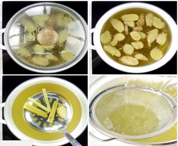 Khi đun xong, để khoảng 30 phút cho nước nguội rồi vớt sả, gừng ra ngoài rồi lọc nước sả, gừng để cho hết cặn.