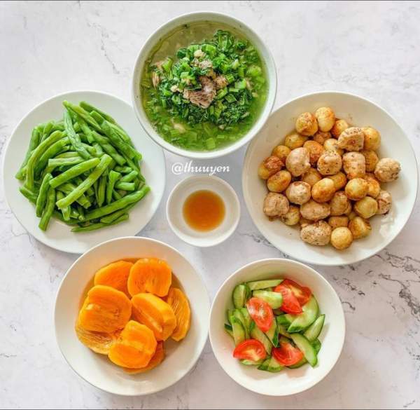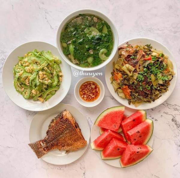 Thu Uyên cho biết, nhà có 6 người nhưng ai cũng ăn ít và không quá cầu kì chuyện ăn uống nên bữa cơm hàng ngày của gia đình Uyên khá đơn giản, thường mâm cơm sẽ có nhiều rau xanh, bát canh, thức ăn mặn, món xào phù hợp với tất cả các thành viên cho gia đình.