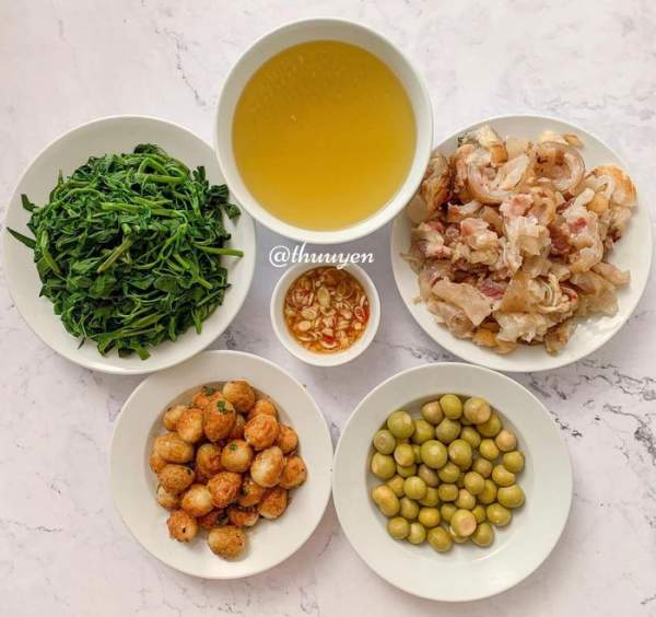 Rau muống luộc; chân bê luộc; trứng cút rim nước mắm.