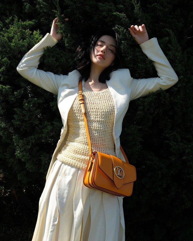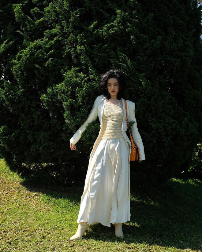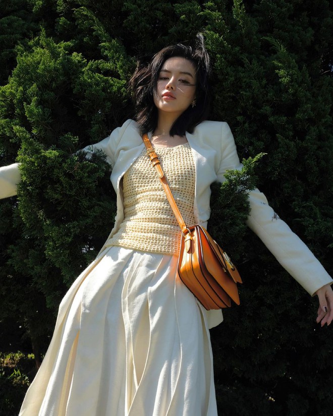 Trùng hợp một nỗi, Khánh Linh cũng vừa thả cả loạt ảnh mới với trang phục gần như tương tự. Có điều, cô em trendy lại chọn mix áo + blazer với chân váy dài, boot trắng và túi nâu của nhà Louis Vuitton cơ.