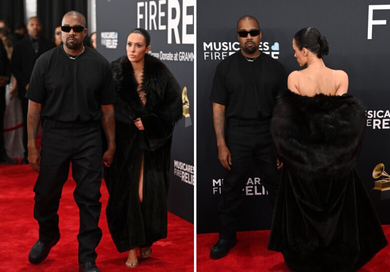 Kanye West, diện trang phục đen từ đầu đến chân, không biểu cảm đứng bên cạnh cho vợ thoải mái tạo dáng. Đây là lần đầu rapper 7X trở lại lễ trao giải Grammy kể từ năm 2015. Vào thời điểm đó, người đồng hành cùng anh là vợ cũ Kim Kardashian.