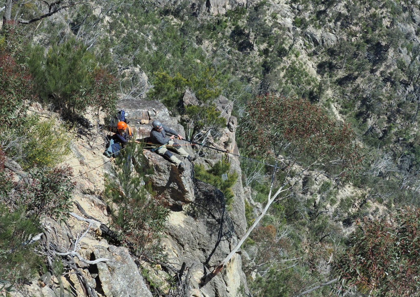 Hai nhà làm vườn Australia đu dây xuống vách đá tại Công viên quốc gia Wadbilliga, bang New South Wales. Ảnh: Vườn Bách thảo Hoàng gia Victoria.